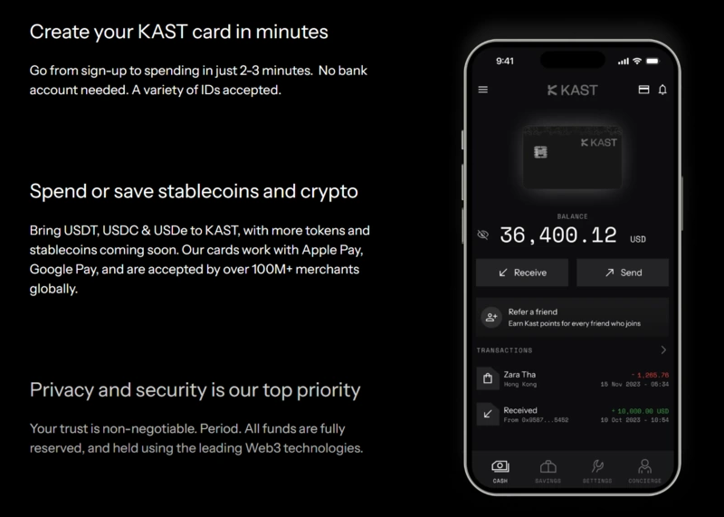 Kast prend en charge plusieurs réseaux blockchain tels qu’Ethereum (ERC-20), Binance Smart Chain (BEP-20) et Solana, offrant ainsi une grande flexibilité et des vitesses de transaction plus rapides.