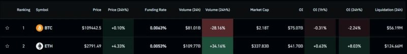 Au cours des dernières 24 heures, l’intérêt ouvert d’Ethereum a bondi de 8,03 %, tandis que celui du Bitcoin a reculé de 2,24 %. Ethereum a également dominé le volume des transactions, avec une hausse notable de 34,16 %, pour un total de 109,77 milliards de dollars, contre une baisse de 28,16 % du volume du Bitcoin, à 81,01 milliards de dollars.