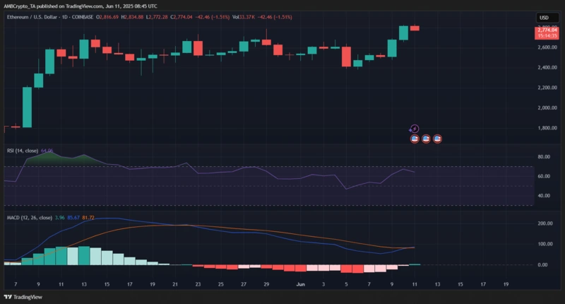 La configuration technique de l’Ethereum suggère qu’une cassure est imminente. L’indice de force relative (RSI) s’établit à 64,06, proche du territoire de surachat, ce qui indique une pression acheteuse croissante. De plus, la convergence/divergence des moyennes mobiles (MACD) est passée à la hausse, la ligne de signal étant sur le point de passer au-dessus, ce qui suggère une nouvelle fois une dynamique haussière.