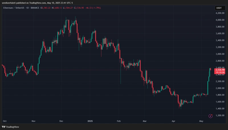 Au moment de la rédaction de cet article, l’Ethereum se négocie autour de 2 525 dollars, en hausse de 5,88 % au cours des dernières 24 heures. Cependant, le volume des transactions s’est légèrement refroidi, chutant de 18 % pour atteindre 33,79 milliards de dollars. Le prochain défi se situe au niveau de résistance de 2 600 dollars, un prix qui a récemment déclenché un bref recul.