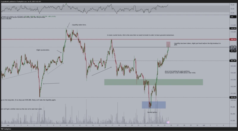 Van de Poppe a souligné la dynamique haussière continue du Bitcoin, suggérant que, malgré une brève période de mouvement latéral, la tendance générale reste positive. Il a identifié 108 900 dollars comme la dernière résistance majeure à franchir pour que le Bitcoin atteigne un nouveau record historique. Selon l’analyste, le Bitcoin a déjà absorbé la liquidité disponible, ce qui annonce généralement le début d’une dynamique plus forte. Si cette tendance se poursuit, il s’attend à ce que le Bitcoin franchisse cette résistance dans les prochaines semaines, pouvant potentiellement établir un nouveau record d’ici juillet.