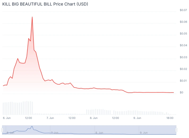 De même, le jeton MELANIA a enregistré une baisse de 13 %. Une nouvelle memecoin appelée KILL BIG BEAUTIFUL BILL (KBBB) a brièvement bondi avant de chuter de plus de 98 %.