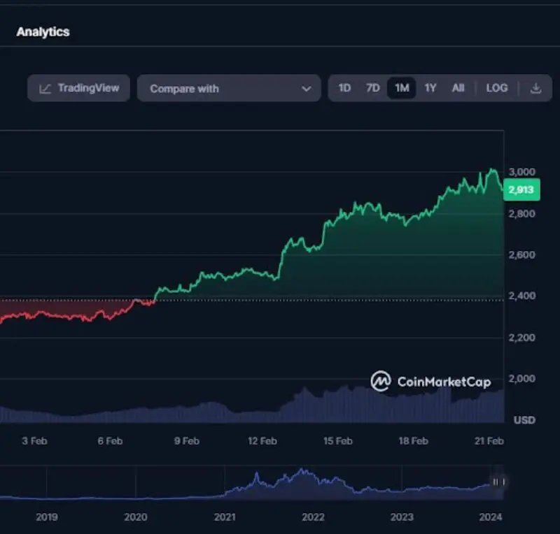 Selon les dernières données récupérées le 21 février, l’Ethereum s’échange actuellement à 2 934,6 $, reflétant une hausse marginale de 0,68 % au cours des dernières 24 heures et une augmentation impressionnante de 8,15 % au cours de la semaine précédente. Cette dynamique haussière constante a culminé avec une hausse cumulée de 21,87 % sur le graphique mensuel, ce qui témoigne de la résilience de l’Ethereum et de son potentiel de croissance soutenue.