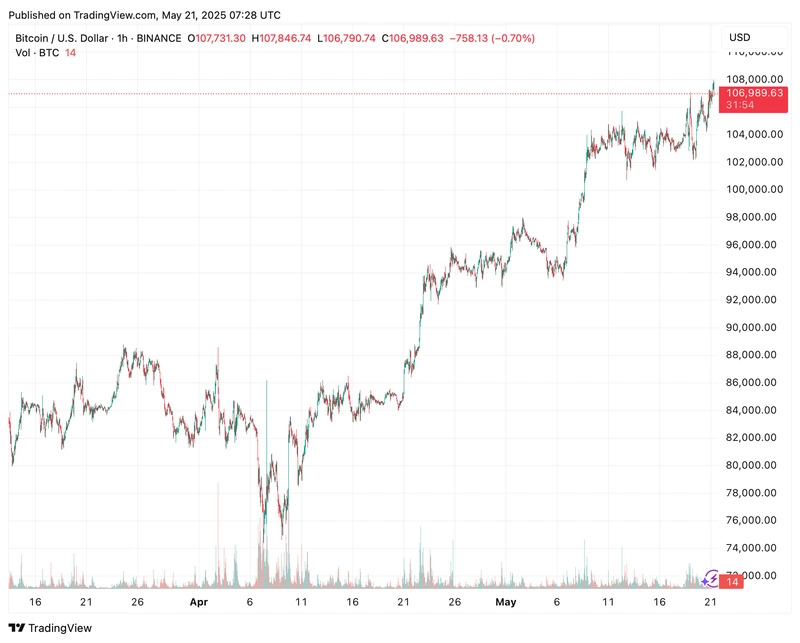 Le Bitcoin a récemment atteint un nouveau sommet d’environ 108 000 dollars le 21 mai 2025, marquant un moment clé de sa reprise actuelle. Contrairement aux pics brutaux et imprévisibles, cette hausse reflète un mouvement ascendant bien organisé et régulier, porté par une véritable vigueur du marché.