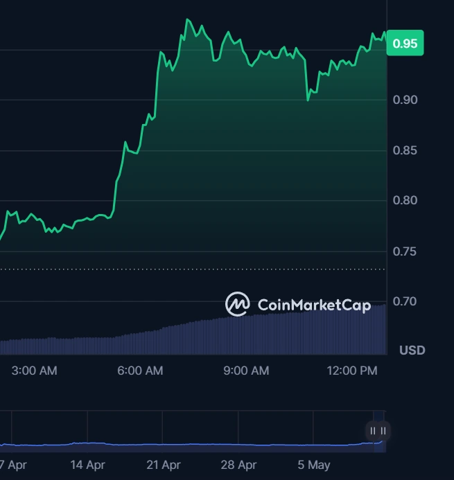 L’enthousiasme n’est pas passé inaperçu sur les marchés. En seulement 24 heures, le prix du PI a bondi de 30 %, pour atteindre 0,96 dollar, juste en dessous de la barre symbolique du dollar. Le volume des transactions a également explosé, bondissant de plus de 160 % grâce à la dynamique observée sur l’ensemble du marché des cryptomonnaies.