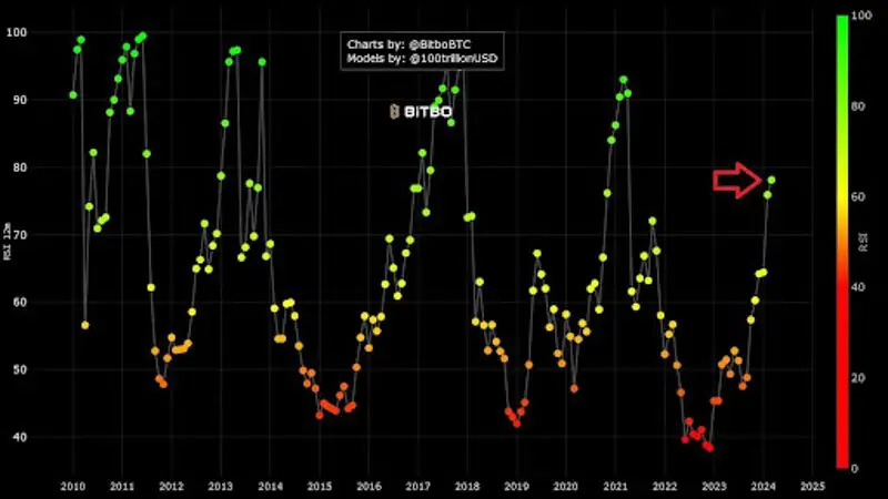 Cette hausse de la demande se reflète dans l’indice mensuel de force relative (RSI) du bitcoin, qui a dépassé le seuil haussier clé de 70, indiquant des conditions de surachat. Bien qu’il soit traditionnellement considéré comme un signal de correction potentielle du marché, les précédents historiques suggèrent que le BTC peut rester suracheté pendant de longues périodes lors de fortes hausses.