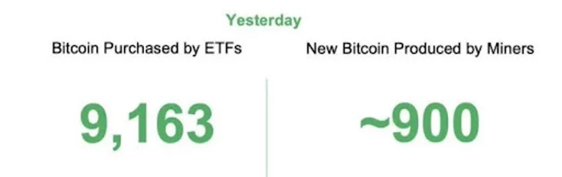Ces ETF, alimentés par la demande d’actions des investisseurs, nécessitent l’achat de quantités correspondantes de bitcoins. Des données récentes indiquent une forte augmentation des achats d’ETF, la demande dépassant largement la production quotidienne de nouveaux BTC par les mineurs.