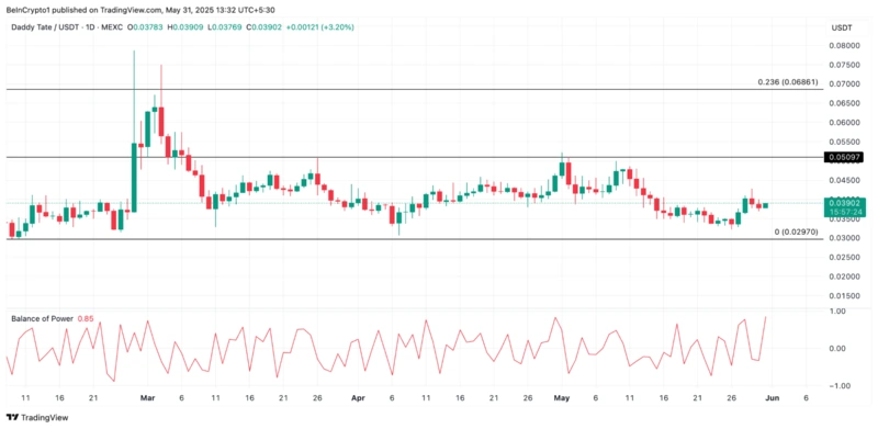 L’indicateur Balance of Power du token, à 0,85, suggère une forte dynamique d’achat. Si elle se maintient, DADDY pourrait remonter à 0,05 $ ; sinon, il pourrait chuter à 0,029 $ si les vendeurs dominent.