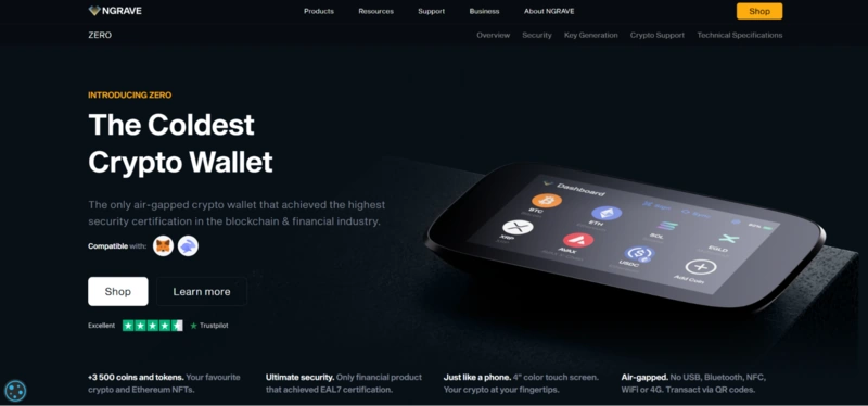 | NGRAVE ZERO | Portefeuille de stockage à froid sécurisé | Certification EAL7, air-gapped, inviolable | Plus de 4 000 actifs | 398 $ | Sécurité maximale, authentification biométrique | Partiellement |