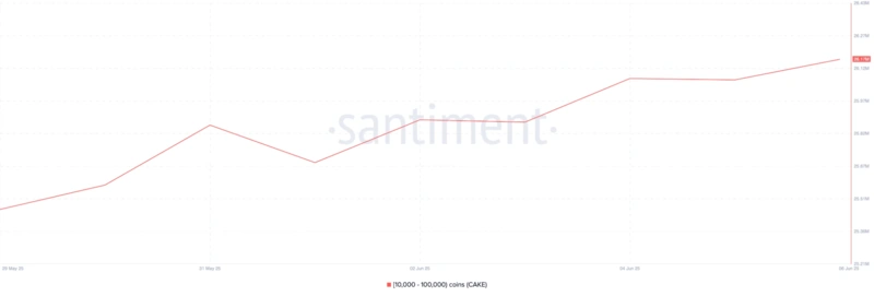 Le jeton natif de PancakeSwap, CAKE, a été l’un des choix préférés des baleines cryptographiques au cours de la première semaine de juin. Les adresses de baleines détenant entre 10 et 100 millions de jetons CAKE ont acheté 710 000 jetons au cours de cette période, selon Santiment.