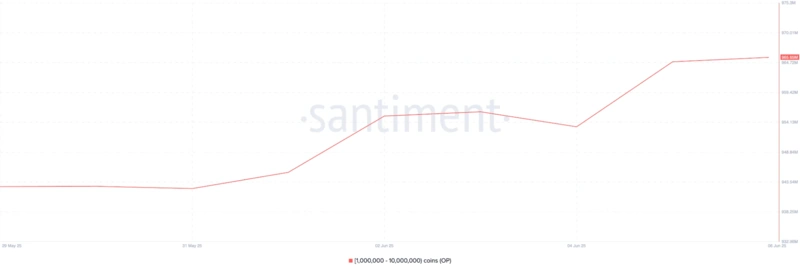 Optimism (OP), une altcoin de couche 2, a également suscité un intérêt considérable de la part des baleines au cours de cette période. Les données on-chain indiquent que les baleines détenant entre 1 et 10 millions de jetons ont ajouté 17 millions de jetons OP au cours de la semaine dernière.