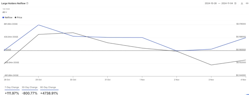 Dogecoin (DOGE), l’une des principales cryptomonnaies meme, a également connu une activité considérable de la part des baleines cette semaine. Cela ressort clairement de l’augmentation de 112 % du flux net des grands détenteurs au cours des sept derniers jours.