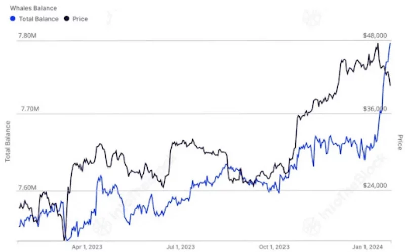 « Alors que les ETF bitcoin ont connu des entrées nettes de 820 millions de dollars, les baleines bitcoin ont vu une augmentation de ~3 milliards de dollars (76 000 BTC) jusqu’à présent en 2024 », a déclaré IntoTheBlock dans une lettre d’information hebdomadaire. « Les baleines comprennent toute entité, individu ou fonds (y compris les ETF) détenant plus de 1 000 BTC. »