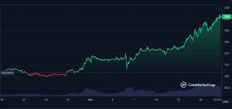 La performance du jeton dans des délais plus courts est tout aussi impressionnante. Au cours du mois dernier, Solana a fait un bond de 88,86 %, et il affiche une augmentation de 40,30 % au cours de la semaine écoulée. Au cours des seules dernières 24 heures, sa valeur a encore augmenté de 7,64 %, portant son prix à 208,01 dollars au moment de la rédaction de ce rapport.