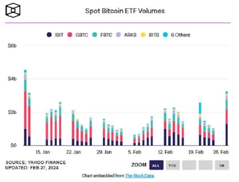 En outre, les neuf nouveaux ETF ont établi un nouveau record de volume quotidien hier, avec un volume de transactions atteignant 2,4 milliards de dollars, avec en tête l’ETF de BlackRock qui a dépassé la barre du milliard de dollars, dépassant ainsi le précédent record quotidien établi le premier jour où les instruments ont été négociés.