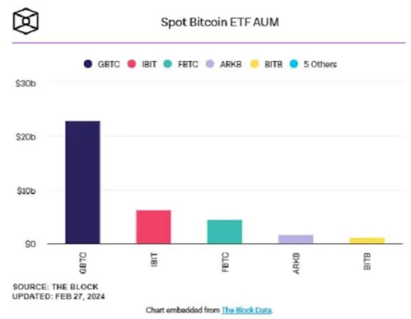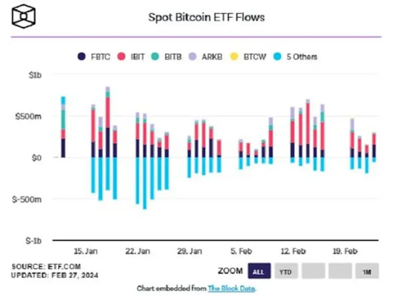 Des données récentes de K33 Research révèlent que ces neuf ETF ont collectivement accumulé 303 002 BTC, évalués à environ 17 milliards de dollars sur la base des chiffres de clôture d’hier. Lancée le 11 janvier, cette cohorte d’ETF comprend des entités renommées telles que BlackRock (IBIT), Fidelity (FBTC), Bitwise (BITB), Ark Invest 21Shares (ARKB), Invesco (BTCO), VanEck (HODL), Valkyrie (BRRR), Franklin Templeton (EZBC) et WisdomTree (BTCW), ce qui représente un éventail diversifié d’acteurs entrant dans l’arène de l’investissement en bitcoins.