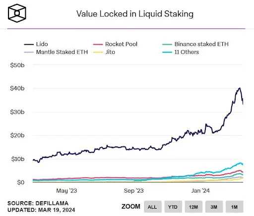 Lido, l’une des principales entités dans ce domaine, supervise actuellement des opérations de jalonnement pour l’éther d’une valeur d’environ 35 milliards de dollars, ce qui souligne l’ampleur des activités de jalonnement au sein du réseau Ethereum.