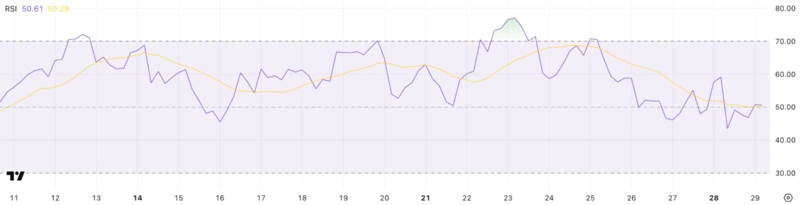 L’indice de force relative (RSI) de Solana a connu une forte baisse, passant de 70,52 il y a seulement quatre jours à 50,61. Cette chute rapide reflète le ralentissement de la dynamique des prix de SOL après avoir dépassé les 150 dollars, ce qui suggère que la dynamique haussière commence à s’estomper.