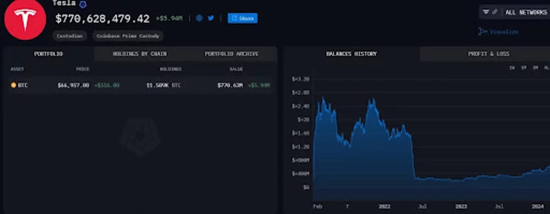 La récente hausse des avoirs en bitcoins de Tesla a ravivé de ferventes discussions au sein de la communauté des crypto-monnaies, en particulier avec l’intégration de la fonction de suivi du portefeuille bitcoin de Tesla dans la plateforme d’analyse d’Arkham Intelligence. À l’heure actuelle, le portefeuille numérique de Tesla affiche un montant impressionnant de 11 509 BTC, ce qui représente une augmentation notable de 1 789 BTC depuis son dernier rapport sur les résultats, dans lequel la société déclarait détenir 9 720 BTC.