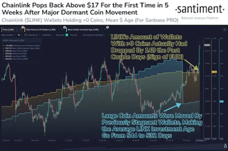 Chainlink vise actuellement de nouvelles étapes de prix, la barre des 20 dollars étant identifiée comme la prochaine cible, grâce à d’importantes activités sur la chaîne. Les données de Santiment indiquent une recrudescence des portefeuilles précédemment dormants, ce qui a entraîné le pic d’âge consommé le plus élevé pour Chainlink, soit 5,38 milliards. Cet afflux de LINK dans la circulation du réseau a joué un rôle essentiel dans la récente hausse.