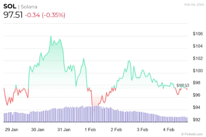 Au moment de la dernière mise à jour, Solana se négocie à 97,51 $, subissant des pertes hebdomadaires d’environ 0,1 %.