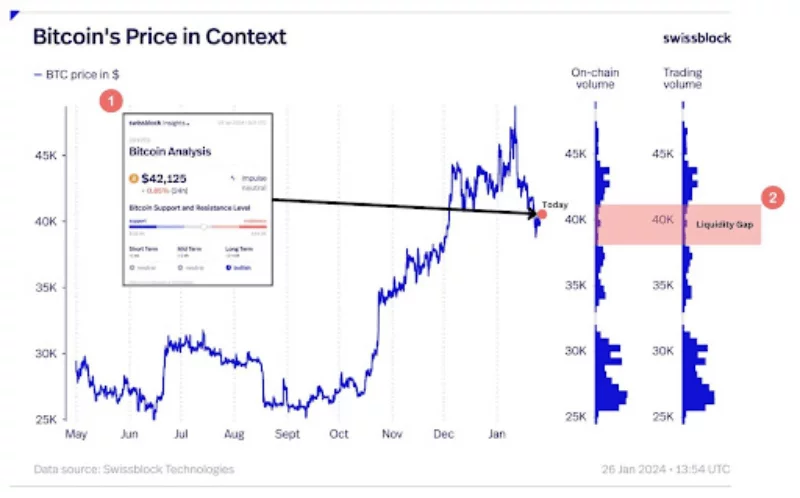 - Analyse du bitcoin : Le bitcoin a bondi à 42 200 dollars, créant des liquidités pour les positions longues, et l’impulsion générale reste neutre.