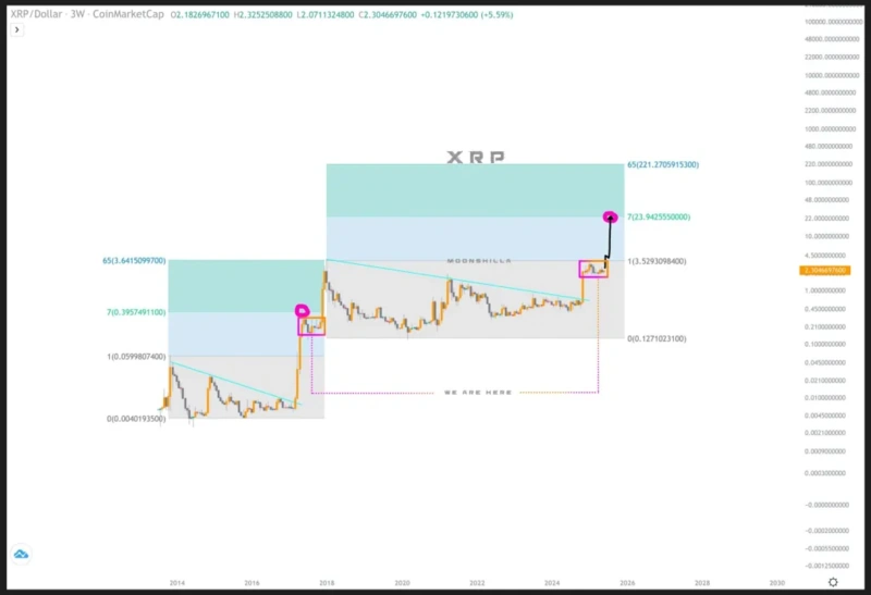 L’analyse de Pepa, qui utilise les niveaux de retracement de Fibonacci, indique que le XRP pourrait potentiellement grimper à 23,94 dollars, soit une augmentation massive d’environ 931,9 %, s’il atteint le niveau de Fibonacci 7. Cette projection est soutenue par les mouvements historiques des prix, ce qui suggère qu’une percée pourrait être imminente.