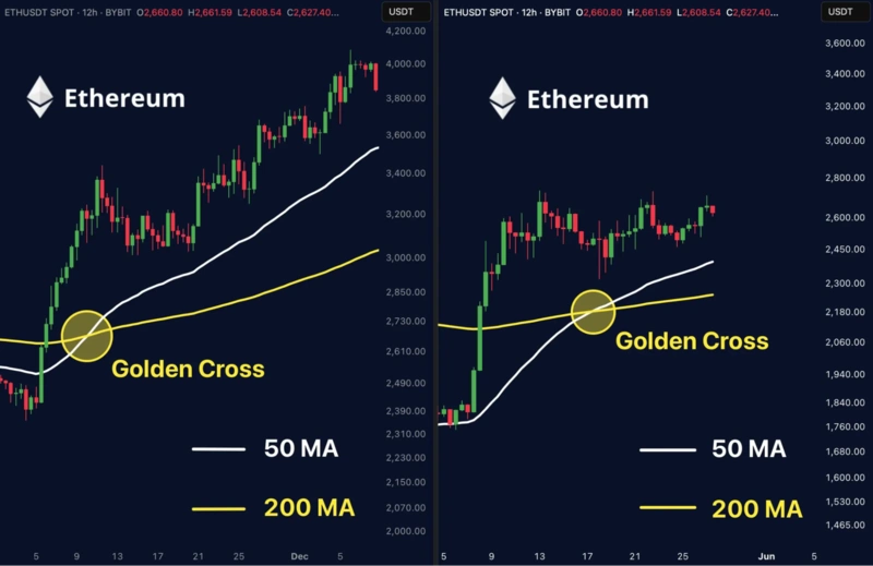 Un trader renommé a identifié une configuration prometteuse pour Ethereum avec l’apparition d’une croix dorée sur le graphique 12 heures.